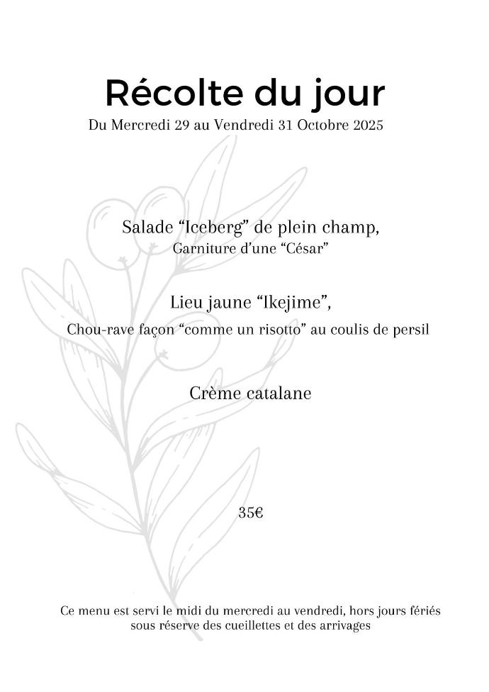 Chaque jour, le Chef donne libre cours à son inspiration, selon la saison, et propose une entrée, un plat et un dessert à partir de produits rares et nobles. Création éphémère pour gourmets curieux.